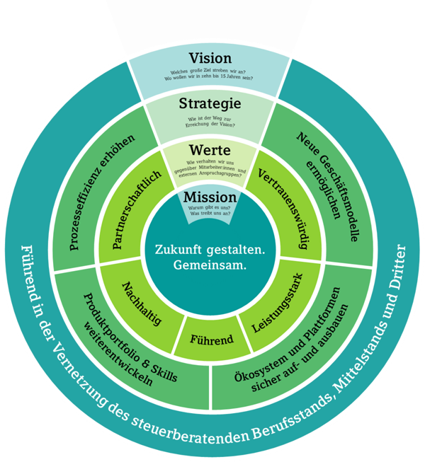 Selbstverständlich beschäftigt sich auch DATEV kontinuierlich mit strategischen Fragestellungen zur zukünftigen Ausrichtung und Weiterentwicklung der Genossenschaft. Laut einer Studie von EY kennen allerdings durchschnittlich 94 Prozent der Mitarbeitenden eines Unternehmens die eigene Strategie nicht. Damit alle DATEV-Mitarbeitenden sich intensiv mit der Strategie beschäftigen und diese in ihrem Arbeitsalltag umsetzen können, wurde ein Projekt zur Strategieaktivierung und -kommunikation ins Leben gerufen. 2023 wurde die überarbeitete Strategie in einem ersten Schritt kürzer und verständlicher formuliert und visualisiert. Das Ergebnis: der Strategiekreis von DATEV. Er zeigt auf einen Blick alle wichtigen Elemente unserer Strategie: die Vision, die vier strategischen Handlungsfelder, die Werte sowie unsere Mission.